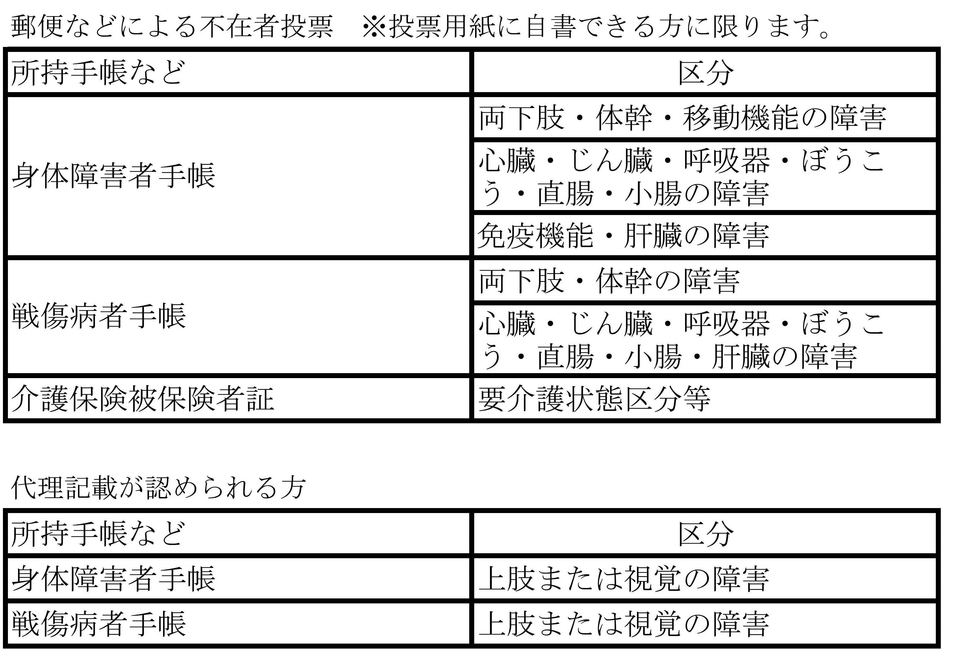 身体が不自由な方で以下の区分に該当する方は、不在者投票ができます。