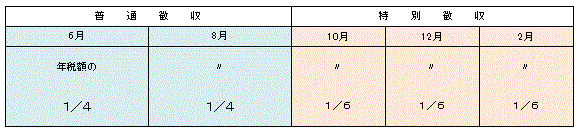 - 年度前半:公的年金等に係る年税額の4分の1ずつを6月・8月に2回に分けてご自身で納めます。(普通徴収)