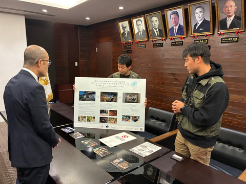 地震で被害を受け、解体が予定される古民家から古材を回収し、住宅の建材や家具などに再利用を行う「のと古材レスキュープロジェクト」が2025年度グッドデザイン賞を受賞したとして、一般社団法人のと復興ラボの山本氏などが市長への受賞報告のため市役所を訪れました。