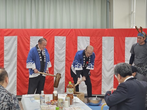 輪島自衛隊友の会主催のもちつき行事が行われ、市長も招待を受け参加しました。挨拶を述べた後実際にもちつきを行い、自衛隊員や友の会のメンバーと交流を深めました。