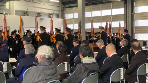 輪島消防署にて、一年間の無火災・無災害を祈願し消防出初式が行われました。市内の消防団員や消防職員が参加しており、市長も出席し式辞を述べるとともに表彰が行われました。