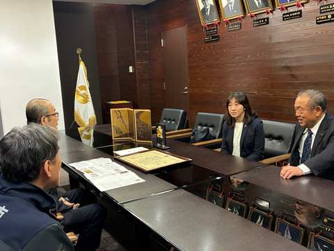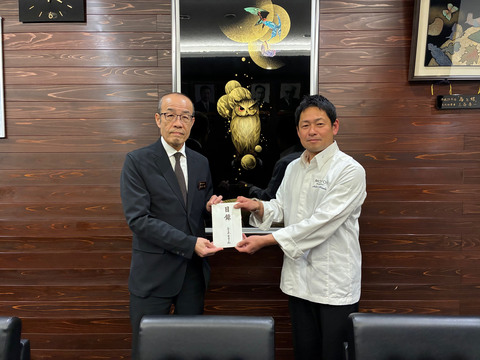 全日本・食学会様から復興支援として、売上金の一部を寄附金としていただきました。当日は、京都でお店を構える前田シェフから目録を受け取り、市長が感謝の言葉を伝えました。